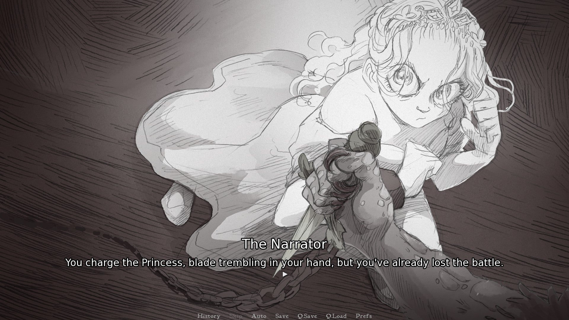 Todas estas preguntas dan vueltas en mi cabeza cuando entro a la cabina. Hay un cuchillo sobre una mesa, pero algunas pistas más. en mi sombría tarea hasta que bajo las escaleras y encuentro a la princesa encadenada. Ya había intentado hablar con ella en el demo original, así que pensé en cambiar mi estrategia esta vez y no entretenerme en tener una conversación. En cambio, Me acerqué a ella, usé la espada que había cogido al entrar y la apuñalé sin dudarlo. el error de quitar la cuchilla, y ella me apuñaló con su propia arma. Mientras ambos nos desangrábamos en el suelo del mazmorra, quedamos atrapados en el bucle del diseño de nuestro creador.